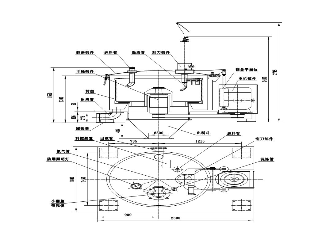 全自动离心机的主机包括:离心机机械部分、进料管、进料阀、洗涤管、洗涤阀、刮刀油缸组件、料位控制器、振动保护仪、电动机;